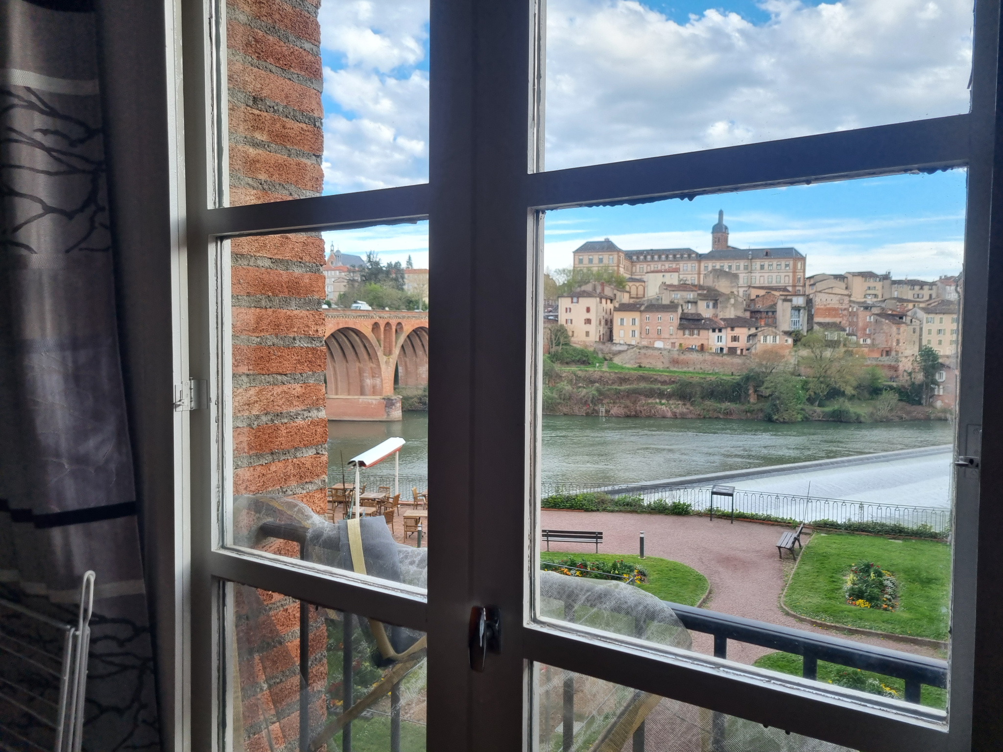 Son séjour spacieux s’ouvre sur une vue imprenable sur le Tarn et les jardins de l’hôtel Mercure, offrant un cadre paisible et verdoyant. La cuisine aménagée et équipée complète cet espace convivial. Côté nuit, vous trouverez deux chambres confortables, une salle d’eau moderne et un WC séparé.